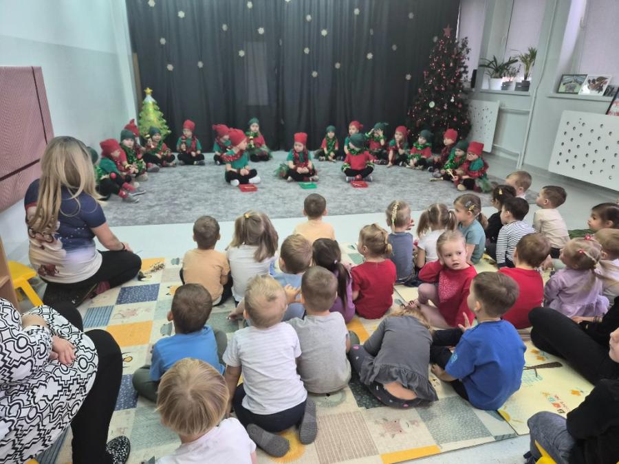 Dzieci z sali orzechowej w ramach współpracy ze żłobkiem, zaprosiły grupy żłobkowych maluszków na występ z okazji zbliżających się Świąt Bożego Narodzenia. Oprócz dzieci żłobkowych gościliśmy również najmłodsze grupy z naszego przedszkola. Wszystkim udzieliła się świąteczna, radosna atmosfera w czasie występu 4-latków ubranych w elfowe stroje.