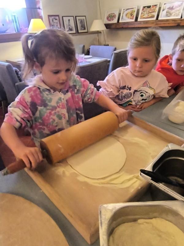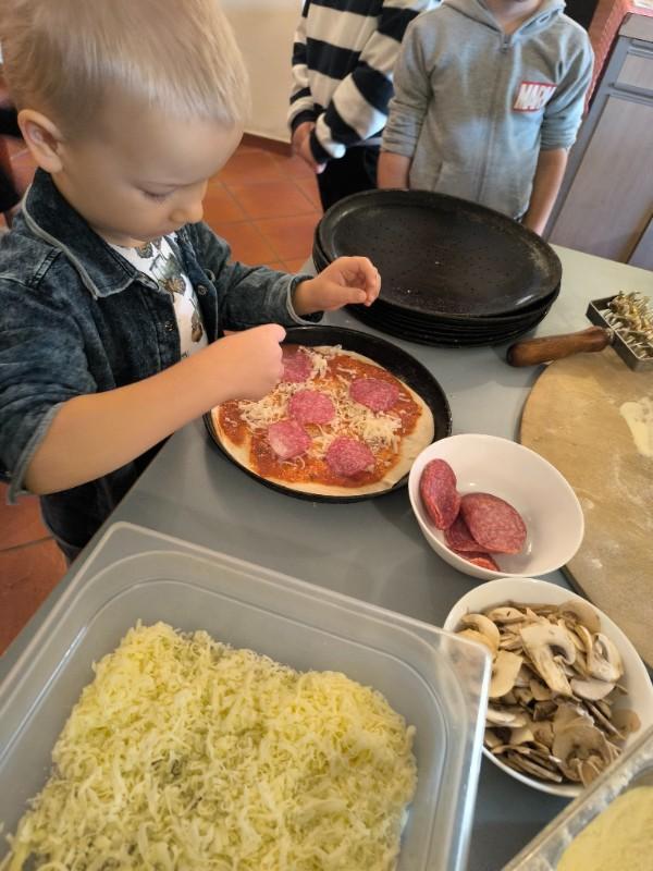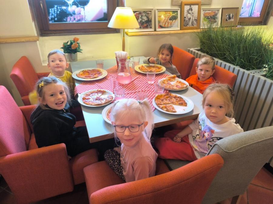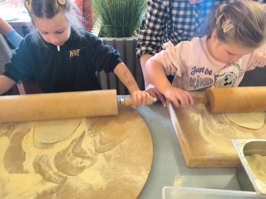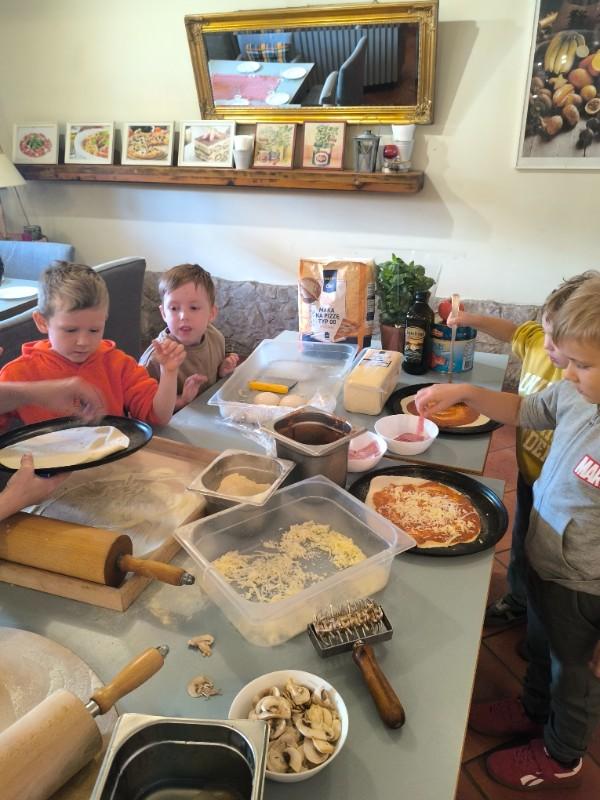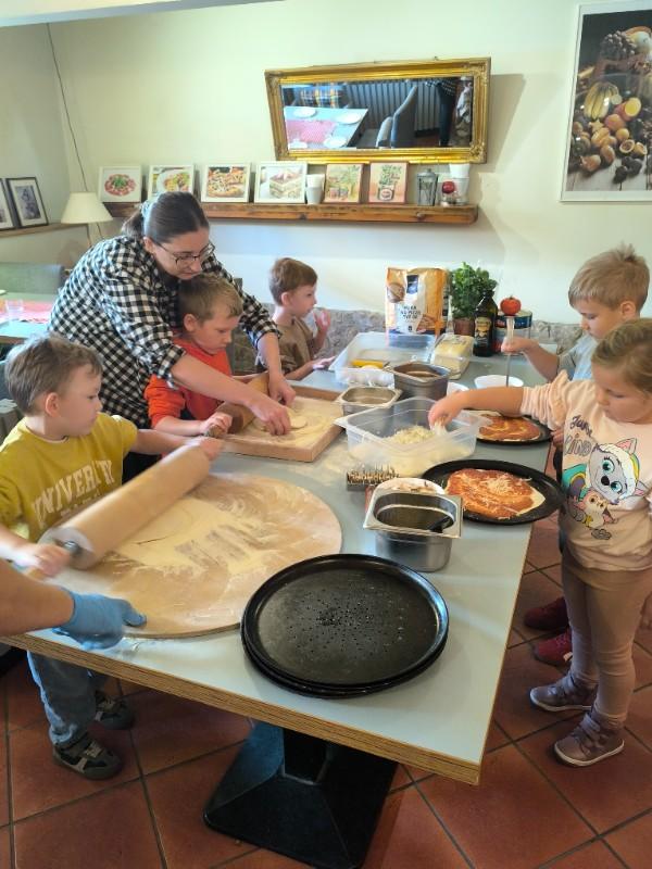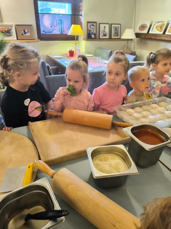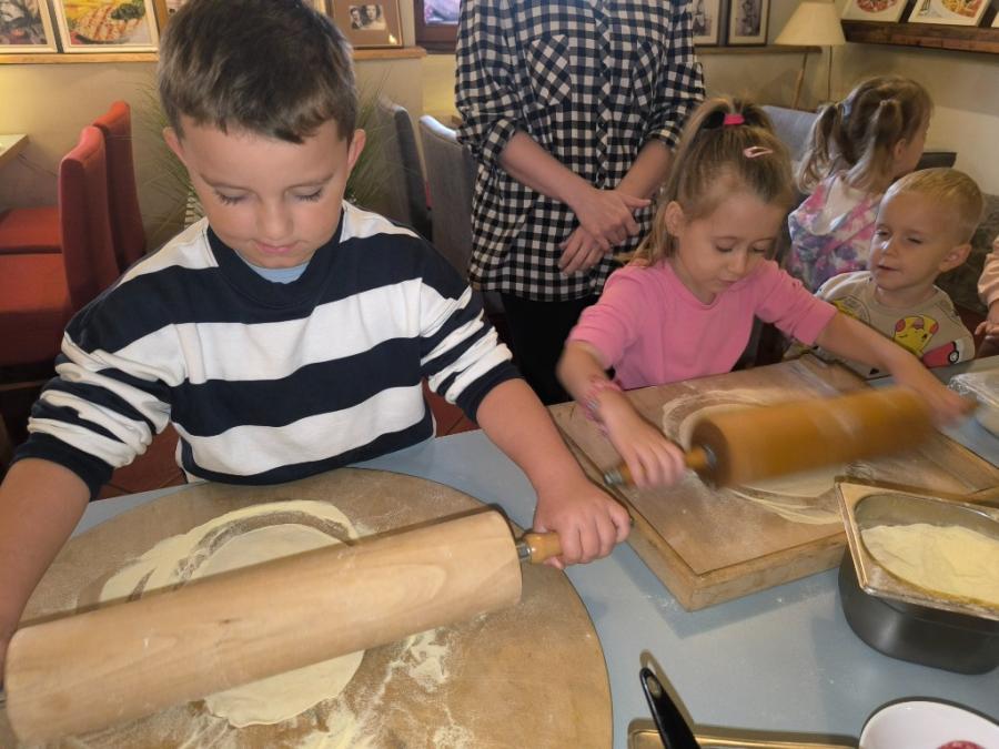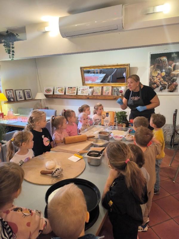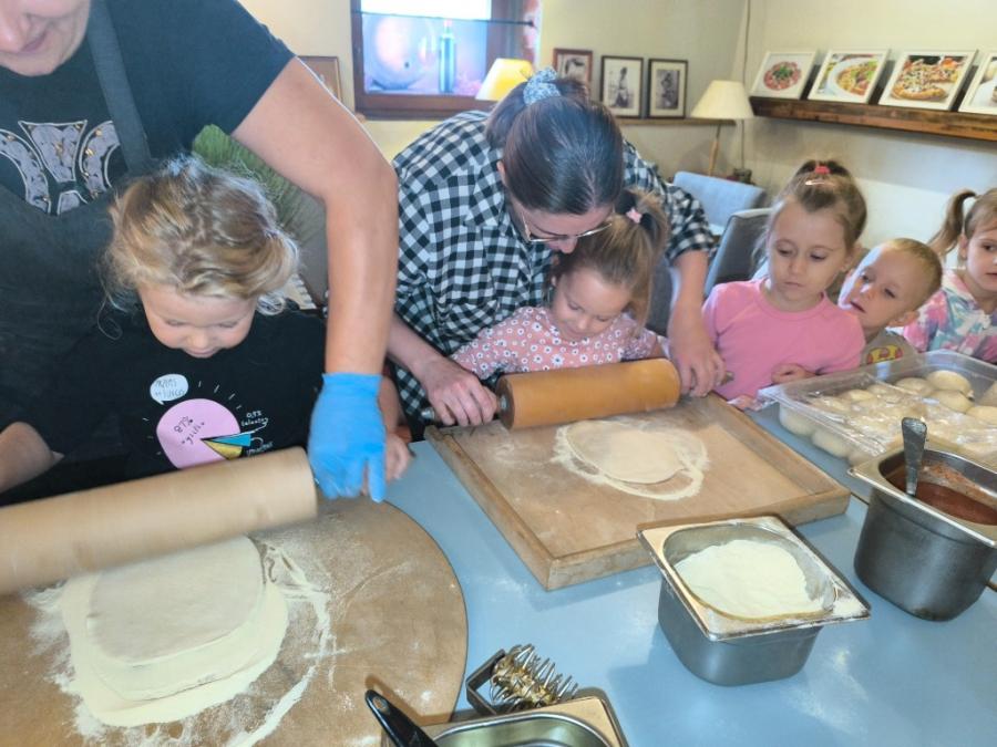 Podczas wizyty dzieci uczestniczyły w ciekawych warsztatach kulinarnych prowadzonych przez panią Magdalenę, w trakcie których własnoręcznie przygotowywały pizzę. Przedszkolaki uczyły się przy tym zasad higienicznego przygotowywania posiłków, poznawały zawód kucharza oraz rozwijały umiejętność współpracy i budowania pozytywnych relacji z rówieśnikami.