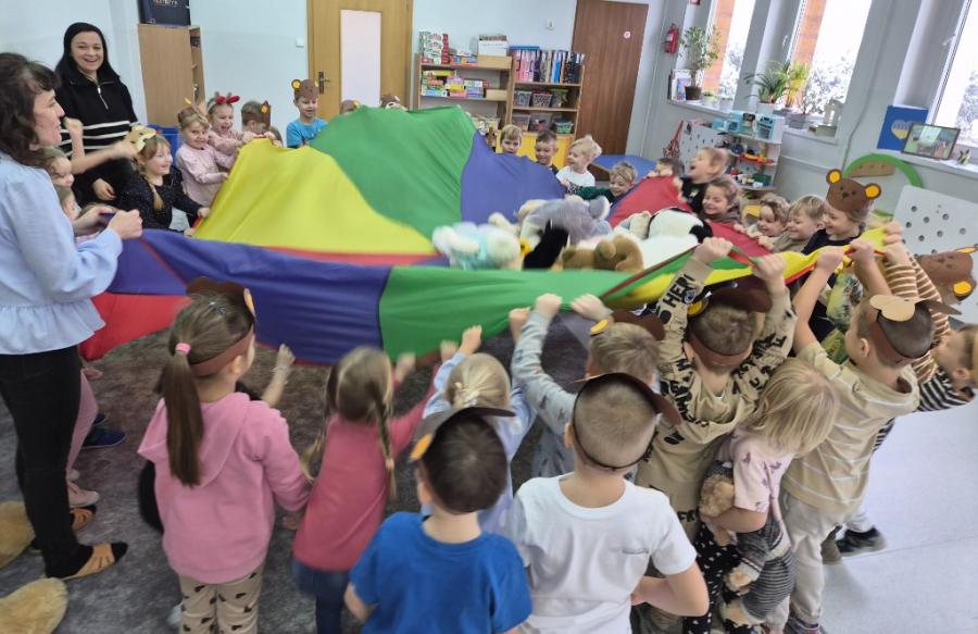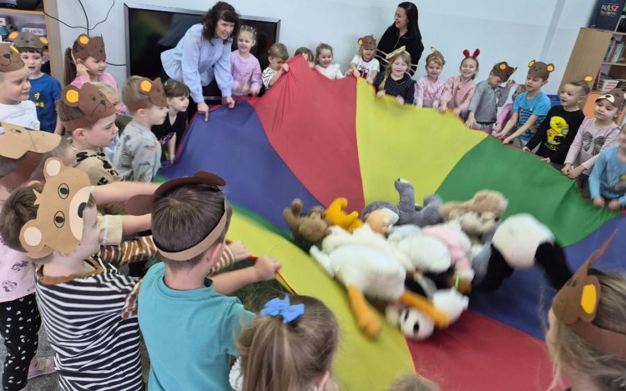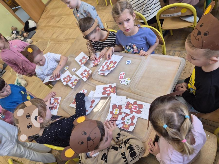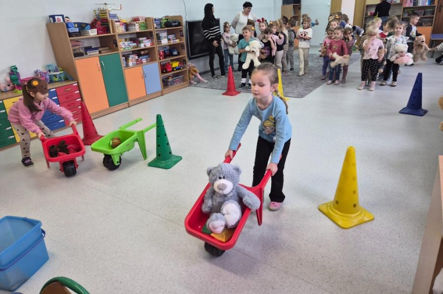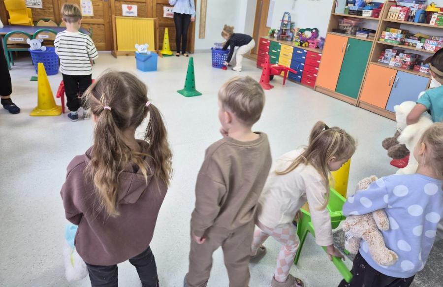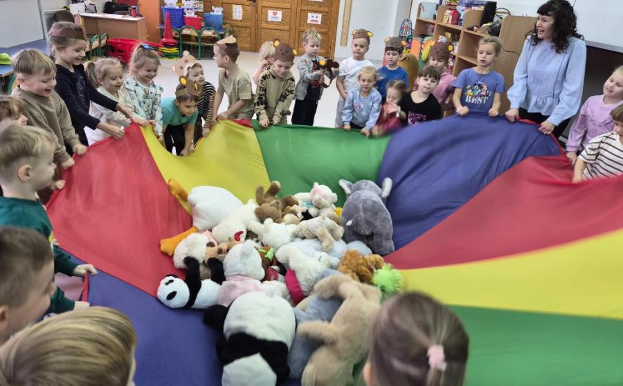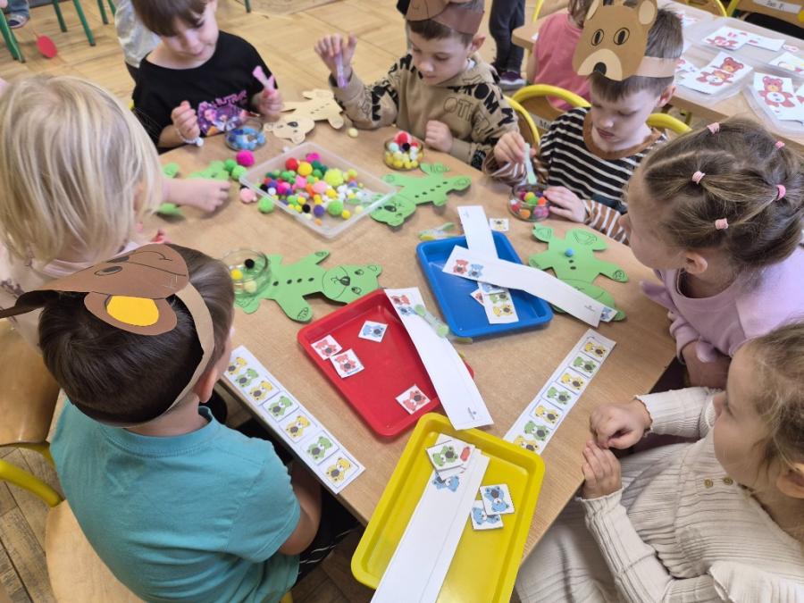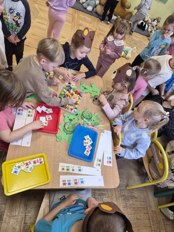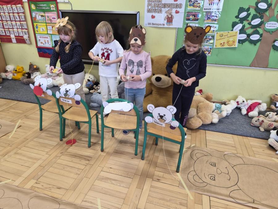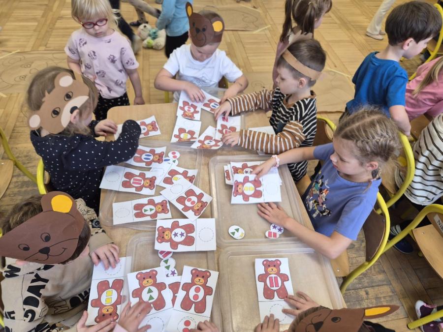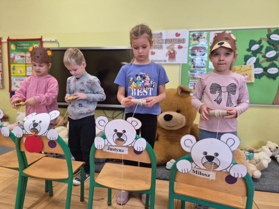 W ten dzień integrowały się ze sobą także różne grupy przedszkolne. Dzieci wspólnie uczestniczyły w zabawach, wymieniały się historiami o swoich misiach, a młodsi i starsi przedszkolacy wzajemnie się wspierali i uczyli. Wspólne aktywności sprzyjały budowaniu relacji i poczuciu wspólnoty w całym przedszkolu.