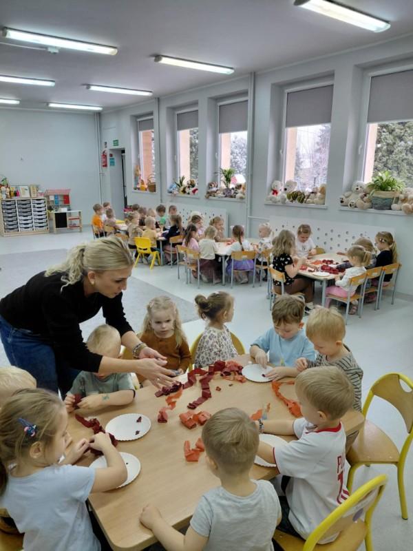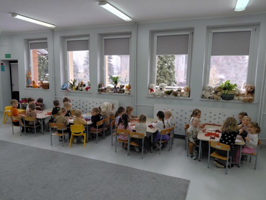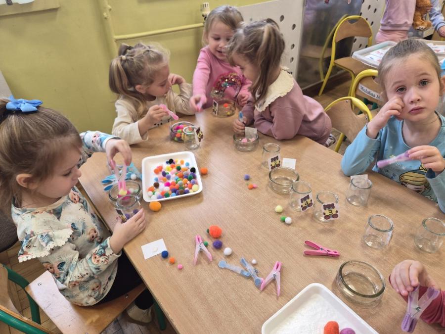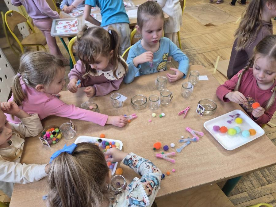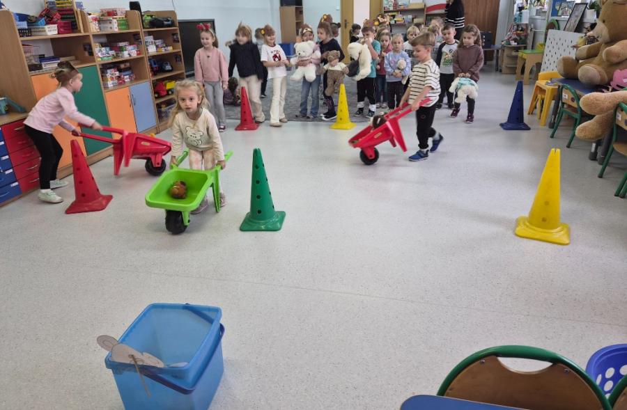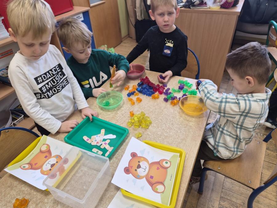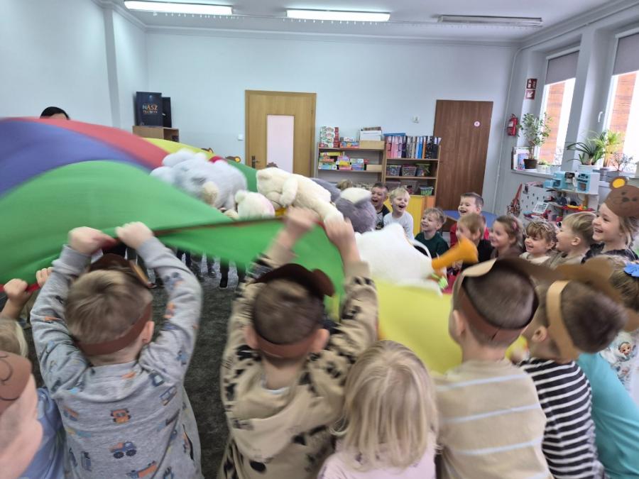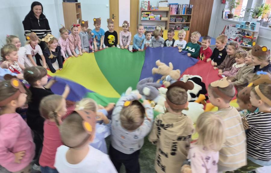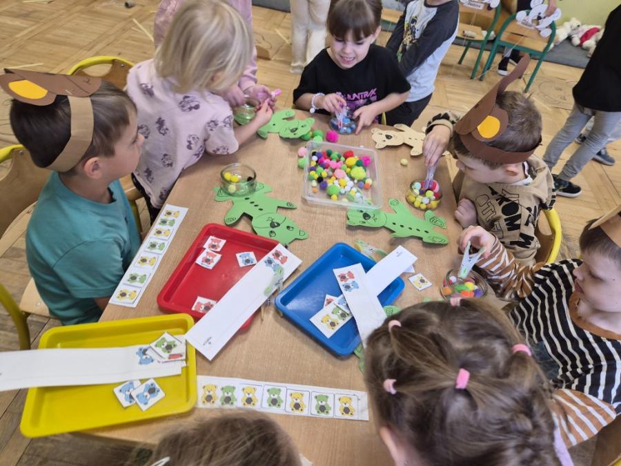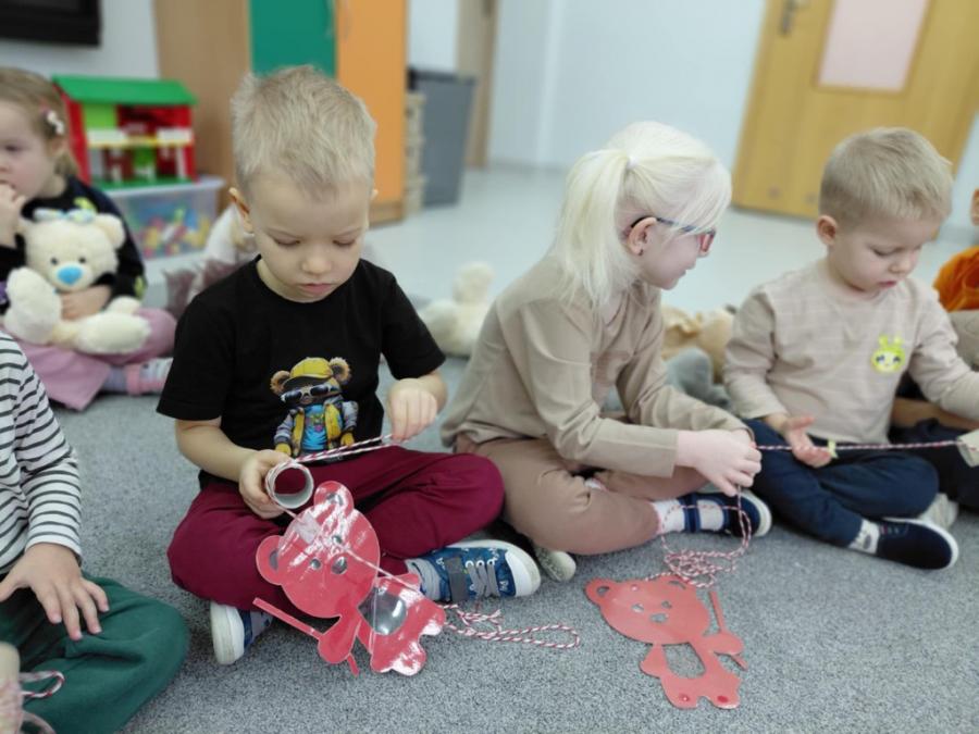 W ten dzień integrowały się ze sobą także różne grupy przedszkolne. Dzieci wspólnie uczestniczyły w zabawach, wymieniały się historiami o swoich misiach, a młodsi i starsi przedszkolacy wzajemnie się wspierali i uczyli. Wspólne aktywności sprzyjały budowaniu relacji i poczuciu wspólnoty w całym przedszkolu.