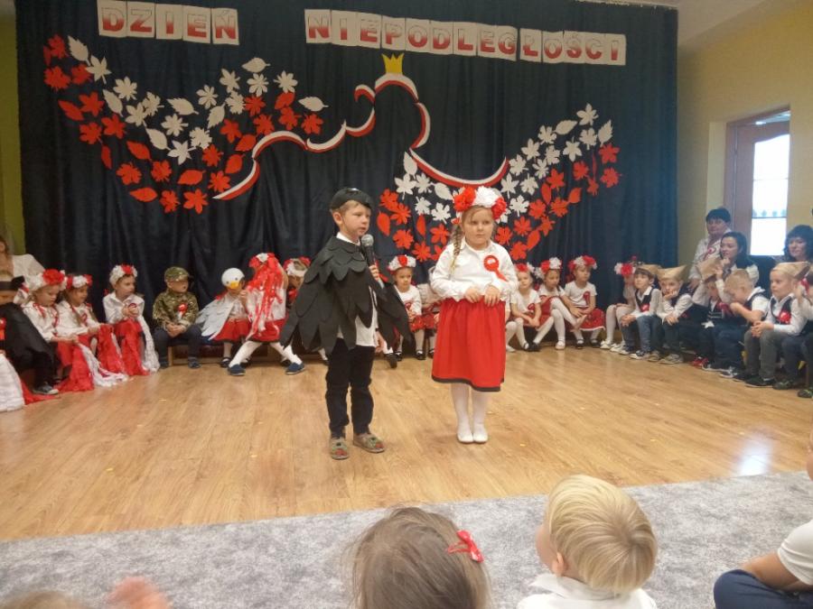 Z okazji Narodowego Święta Niepodległości dzieci z grup „Leśna Polana” i „Jawory” przygotowały uroczysty program artystyczny, w którym zaprezentowały piosenki, tańce oraz wiersze poświęcone naszej Ojczyźnie. Był to pełen wzruszających chwil występ, wypełniony radością, barwami oraz pięknymi gestami najmłodszych, którzy z wielkim zaangażowaniem przedstawili to, co w polskiej tradycji najpiękniejsze.